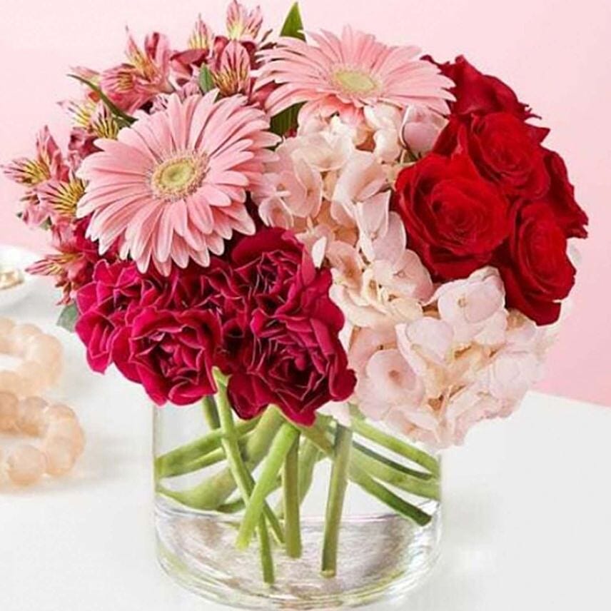 All-around arrangement with red roses; pink hydrangea, Gerbera daisies and Peruvian lilies (alstroemeria); hot pink spray roses, artistically designed in a clear glass cylinder vase.