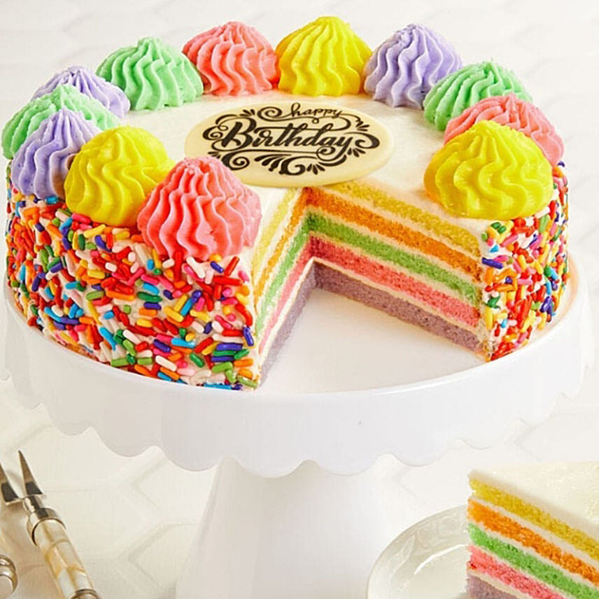 Delicious Rainbow Cake in 5 layers of color and with a fruity flavor and covered with a delicious white-cream frosting and topped with a spectrum of frosting, making it truly colorful for the occasion.