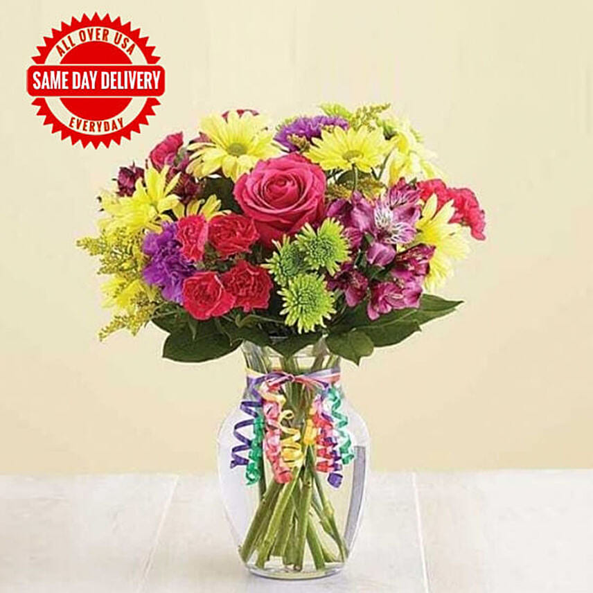 Gorgeous mix of lilies, daisy poms, alstroemeria, statice and aster is perfectly complemented by a clear vase boasting a purple organiza ribbon.