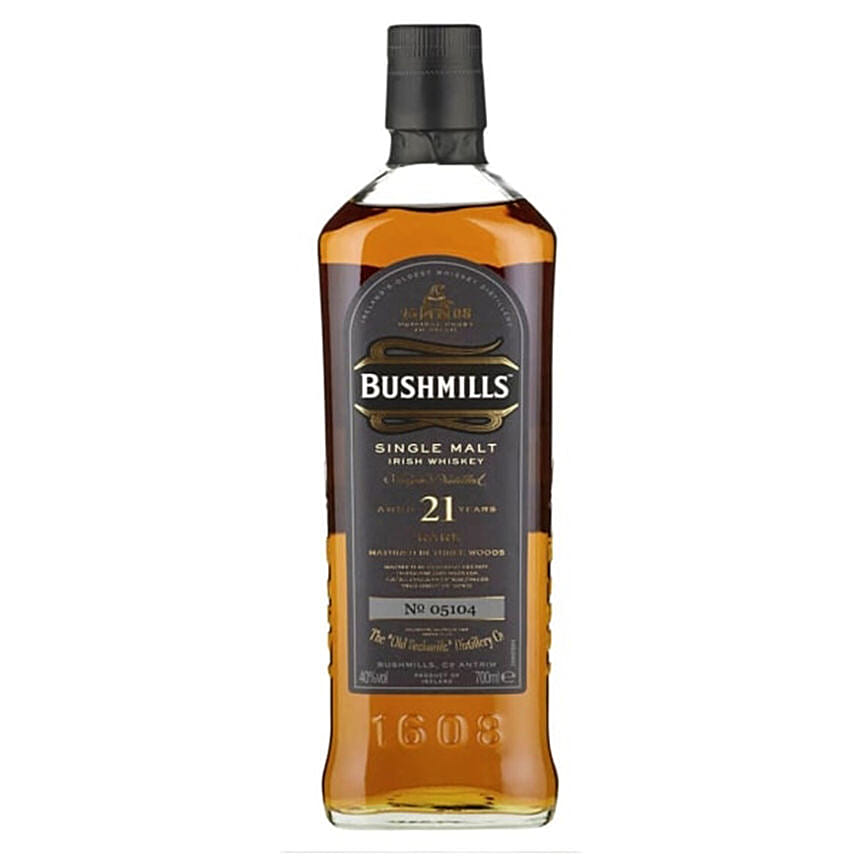 Bushmills Single Malt Whiskey 21 year old is aged for a minimum of 19 years in former Oloroso Sherry and Bourbon-seasoned casks, then transferred into Madeira casks for a further 2 years. The result is a whiskey awarded ‘Best Irish Single Malt 2013’. It has huge depth that interweaves dried fruit flavors with spicy, aromatic maltiness and subtle nutty raisin notes. 750ML / 40% ABV