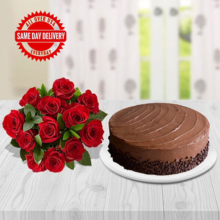 Chocolate Cake With Dozen Red Roses Bouquet. Chocolate cake : 6 inches.