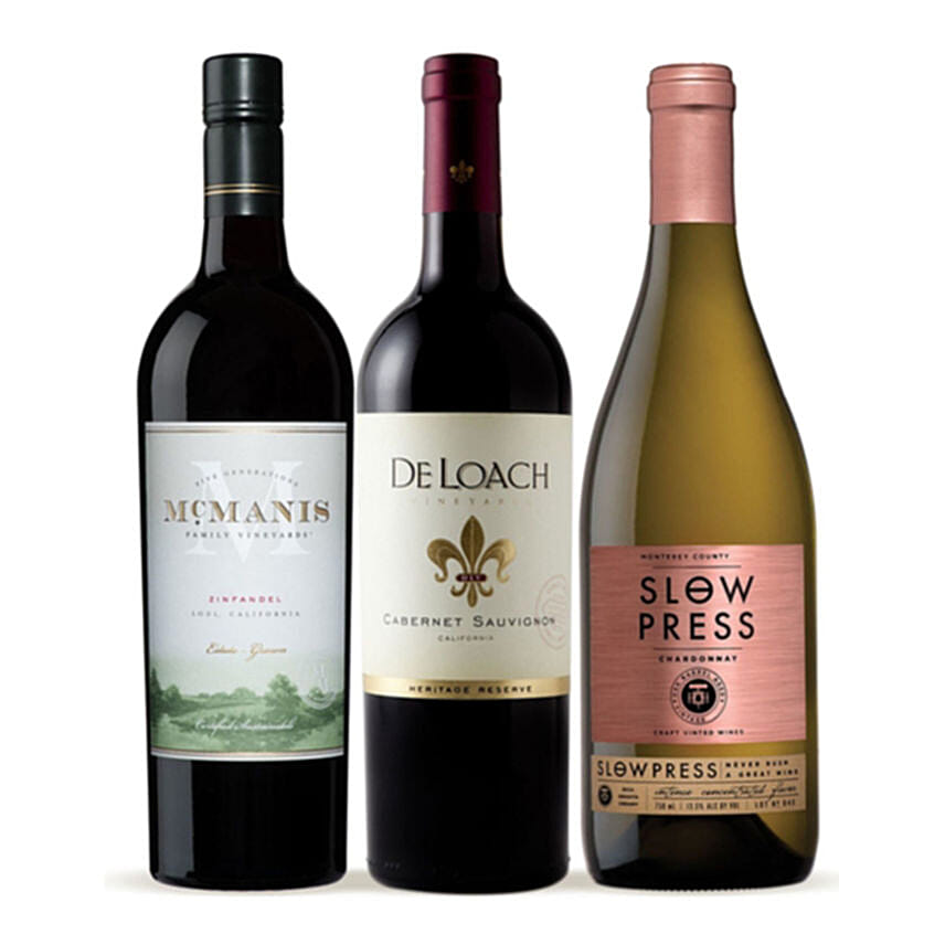 We've gathered three top wines from select regions in California, representing grape varietals that California does best. Wines include: DeLoach Heritage Reserve Cabernet Sauvignon, McManis Family Vineyards Zinfandel and Slow Press Chardonnay