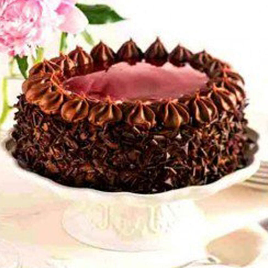 Four layers of moist, chocolate cake is filled with chocolate mousse and raspberry puree, for a perfect balance of fruit and chocolate. With a rich chocolate frosting, topped with raspberry puree, and decorated with chocolate curls, this cake is as pretty as it is delicious. 9" cake , perfect for you and your friends.