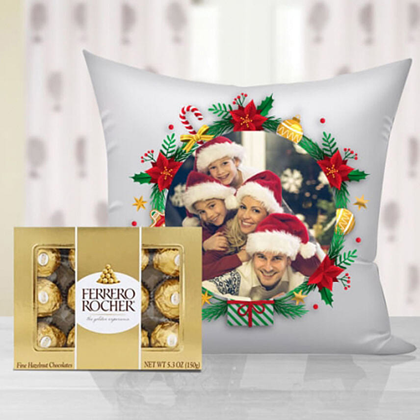 Send your loved ones this personalized Christmas photo cushion and chocolate combo. Perfect for this festive season. Includes 12pc Ferrero Rocher, cushion size 12"x12", (includes cover and cushion). Email us the picture.