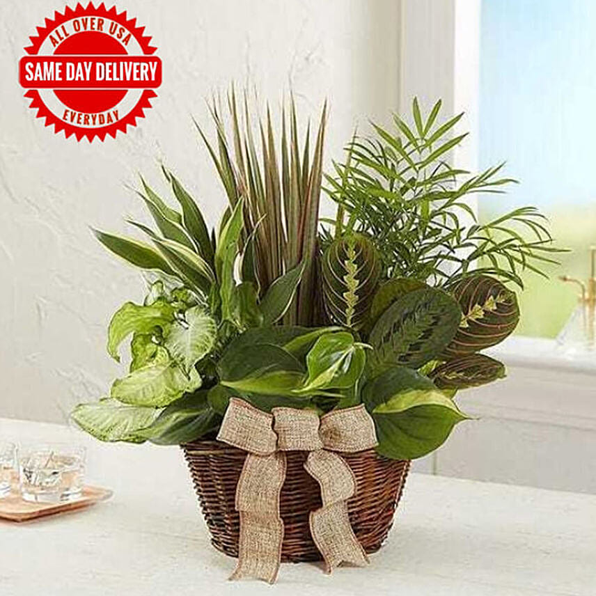 This classic dish garden is hand-designed with a lush variety of fresh plants to spruce up any indoor space. Set in a charming wicker basket with a rustic burlap ribbon, it’s a thoughtful gift for birthdays, housewarmings or any day you want to send a smile.