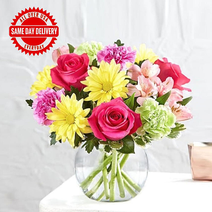 Arrangement with hot pink roses; lime green and magenta carnations; yellow daisy poms; pink Peruvian lilies accented with assorted greenery, designed in a clear glass bubble vase.