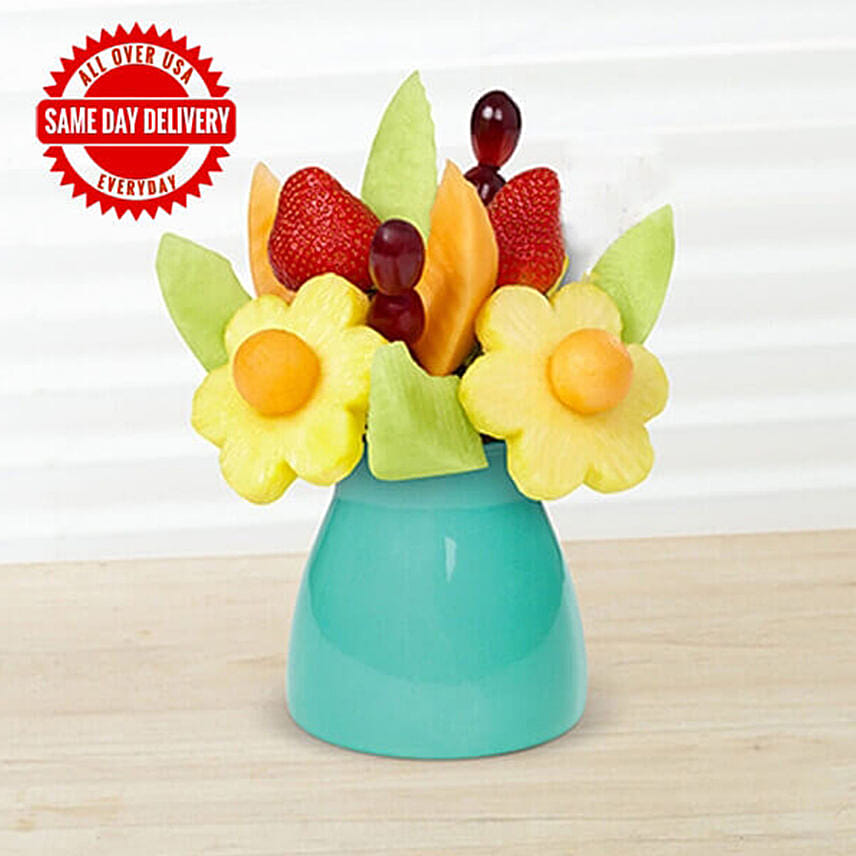 • Treat someone special in your life to this delicious, freshly-crafted arrangement! Pineapple daisies, strawberries, and other fresh fruit favorites are carefully crafted in a keepsake they can use long after all the fruit is gone. Perfect for celebrating birthdays, work milestones, and other special occasions, this gift is the perfect way to make their day extra sweet.