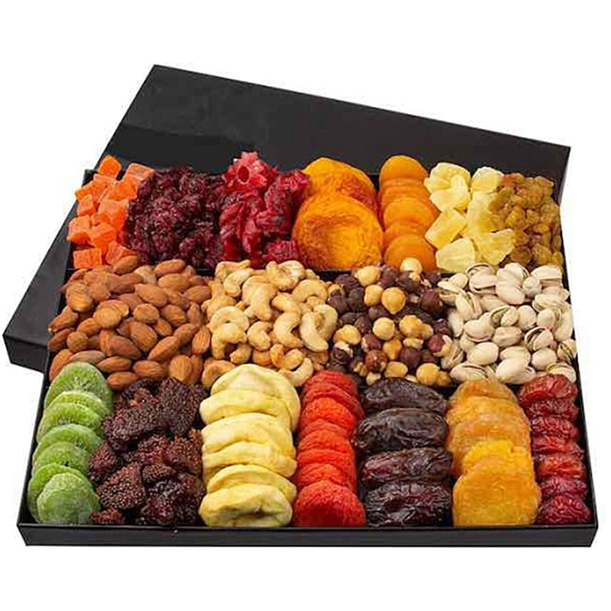Eighteen (18) succulent fruits and nut tray features: Medjool dates, Turkish apricots, pineapple chunks, roasted salted pistachios, dried strawberries, California peaches, roasted salted almonds, dried plums, dried pears, dried hibiscus, papaya chunks, dried cranberries, dried apple rings, kiwi slices, roasted unsalted filberts, roasted salted cashews, golden raisins, and California apricots.