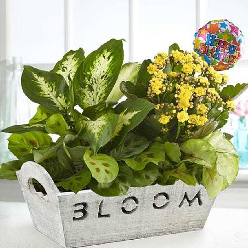 A mix of lush green foliage and blooming plant, it arrives in a wooden window box-style container with handles and stencil-cut ‘BLOOM’ design, paired it with a festive "Happy Birthday" balloon for extra smiles.