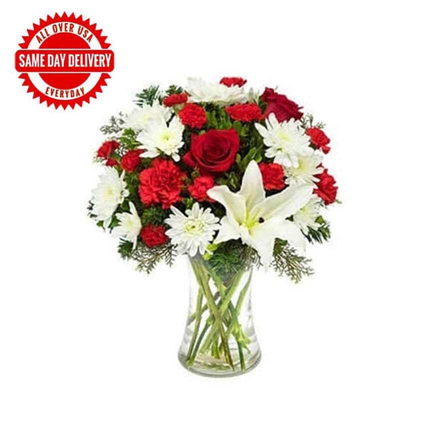 • Bouquet includes Red Roses, White Lilies, Red Mini Carnations alongwith assorted greens.