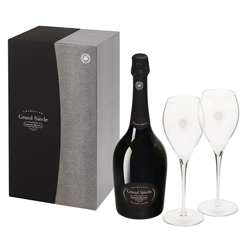 Gift set includes : Laurent-Perrier Grand Siecle Coffret , champagne from France and 2 flutes to make the perfect pair. Laurent-Perrier's prestige cuvées embody luxury, magnificence and elegance fit for a king.It has a bright color, with a brilliant yellow hue. Its subtle aromas of honey, hazelnuts, grilled almonds and brioche, make this the perfect companion for refined dishes. It pairs just as well with poultry and truffles as it does with veal and morel mushrooms.
