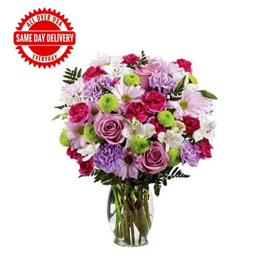 • An arrangement of distinctive flowers like Purple carnations, purple daisy poms, fuchsia mini carnations, green button poms and white alstroemeria.