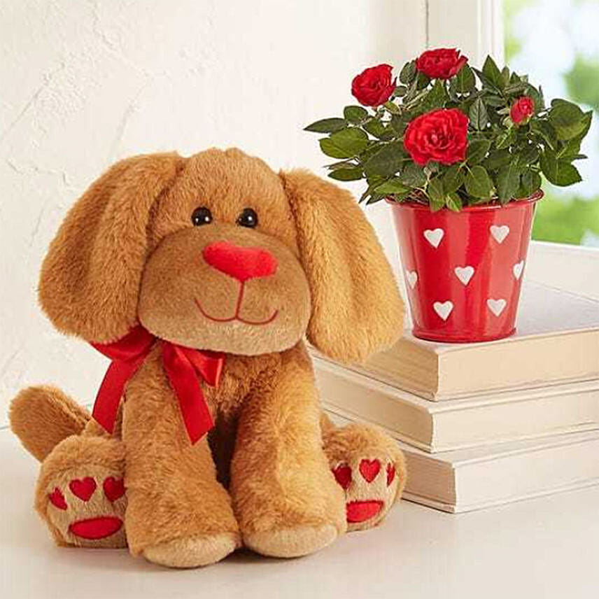 Sporting an adorable heart-shaped nose and heart-print paws, this plush arrives with a charming mini red rose plant designed in a matching heart planter. It’s the perfect pairing of cuddly and classic.
