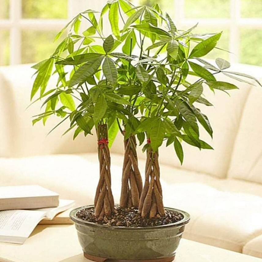 3 braided money trees with five to seven beautiful glossy-green plume-like leaves on each stem in a ceramic planter.
