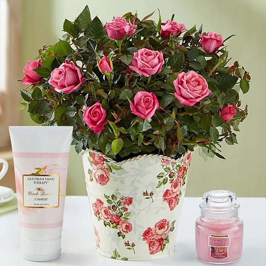 Pink rose plant arrives budding and ready to bloom, Designed in an elegant gray planter with rose pattern and delicate gold scallop rope rim. Complement your gift by adding our rose-scented Yankee Candle on its own or bundled with soothing hand lotion from Camille Beckman in a signature floral fragrance.