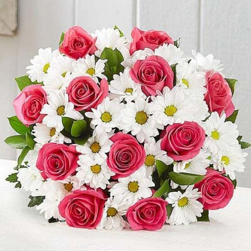 • Bouquet of 12 hot pink roses and 4 white daisy poms; accented with assorted greenery.