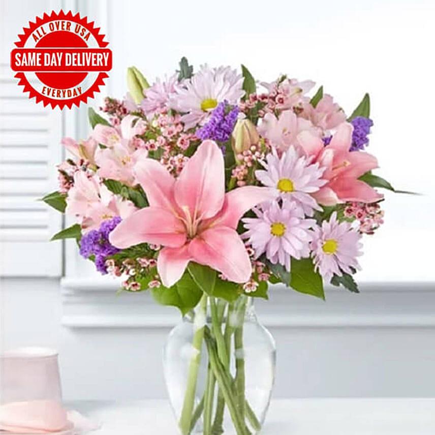 • A stunning arrangement that brings together an abundance of blooms in shades of lavender and pink, creating a blend of soft, pastel color.