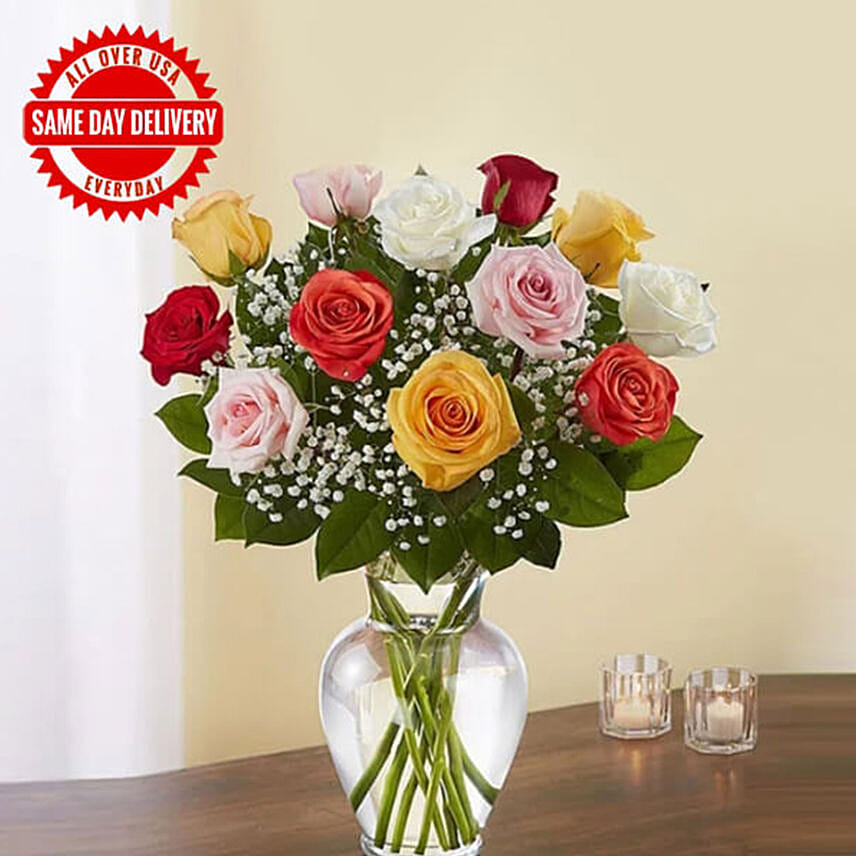 Exquisite bouquet of magnificent 12 long-stem assorted roses with hand-crafted by our expert florists which complements any occasion with unforgettable style.