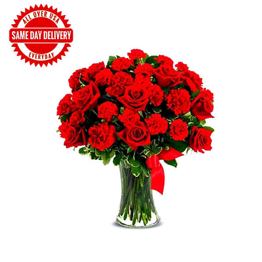 • Red Heart bouquet is created with fresh red roses and red carnations. Delivered in a keepsake glass vase, it is a perfect way of sending your heartfelt emotions.