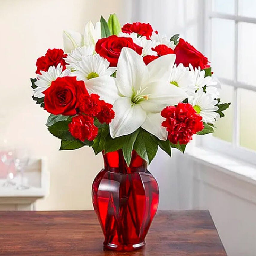 This radiant new bouquet is a beautiful surprise for the one you love. Filled with lush blooms in classic romantic colors, this hand-gathered arrangement arrives in a striking ruby red vase, creating a memorable gift for an anniversary, or the everyday moments you want to hold onto forever.