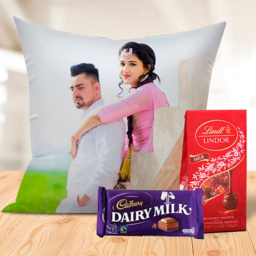 Send your loved ones this personalized cushion and chocolate combo. Perfect for anniversaries, wedding. Includes 1 Cadbury bar (99gm), 12 Lindor balls (144gm), cushion size 12"x12", (includes cover and cushion). Email us the picture.