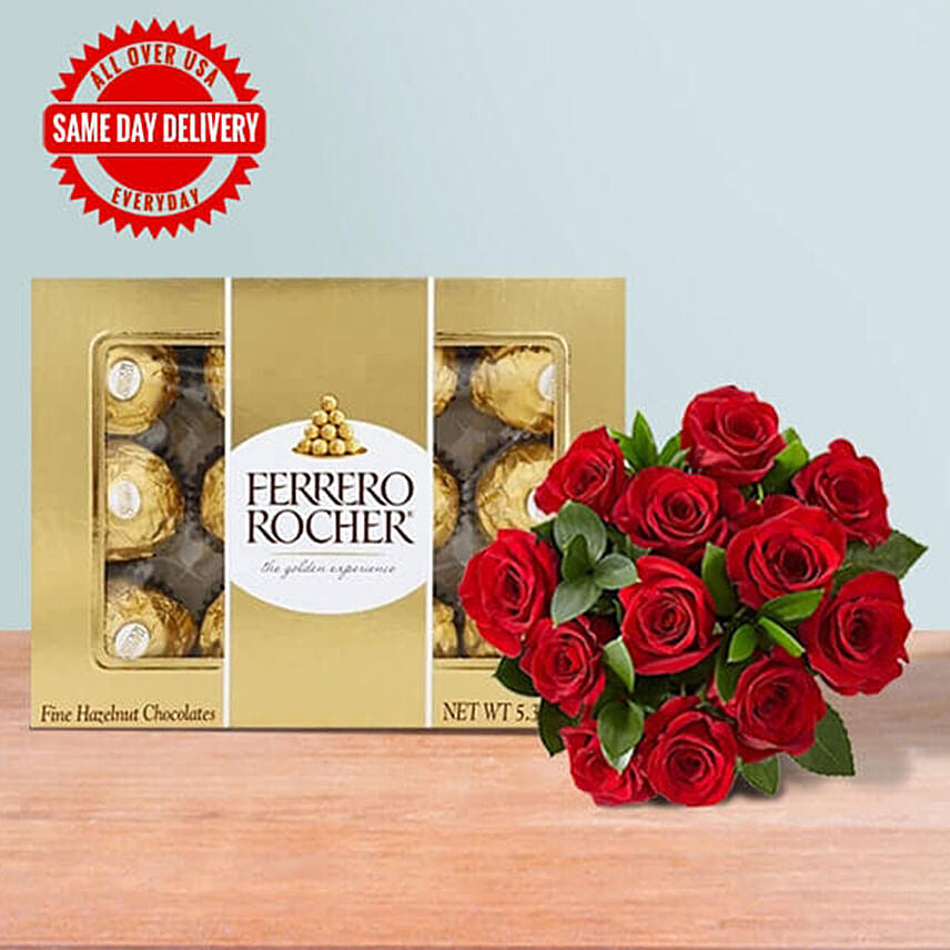 A delighting combo of Dozen Red Roses and 12pcs Ferrero Rocher.