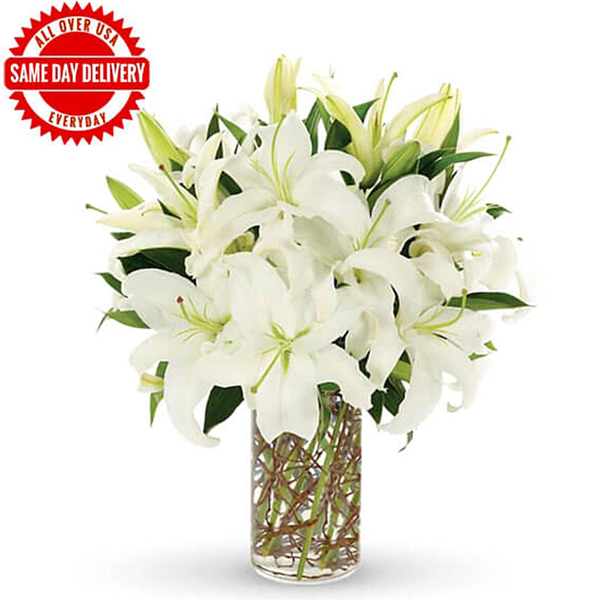 • A remarkable arrangement of White lilies in a clear cylinder vase and curly willow accents finish off a look of rare beauty.