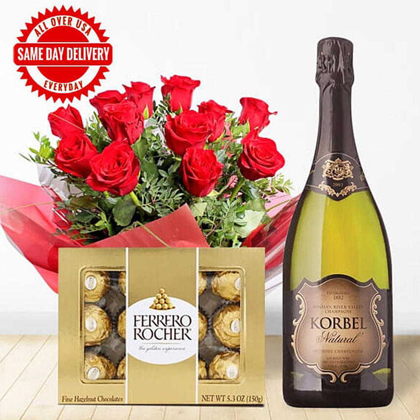 Sparkling wine 750 ml, Red rose bouquet, Ferrero Rocher 12 pc. One of California's most recognized wines, the Korbel Brut is light and crisp with fine citrus and pear notes. Sparkling wines share the unique quality of making any occasion special – and of making special occasions that much more magical.