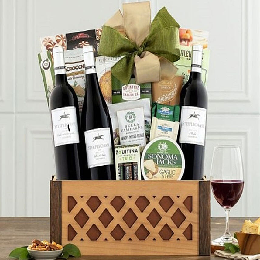 • Steeplechase Vineyards cabernet with black cherry and blackberry flavors, chardonnay with apricot and peach notes, and dark, smooth merlot are paired with a complementary collection that includes Tuttino chocolate cream cookies, Italian rosemary crackers, Sonoma Jacks garlic herb cheese spread, Ghirardelli mint dark chocolate and white chocolate with caramel, Lily O'Brien's sticky toffee, bacon habanero snacks, a trio of olive oils and more to complete this outstanding California wine gift basket.