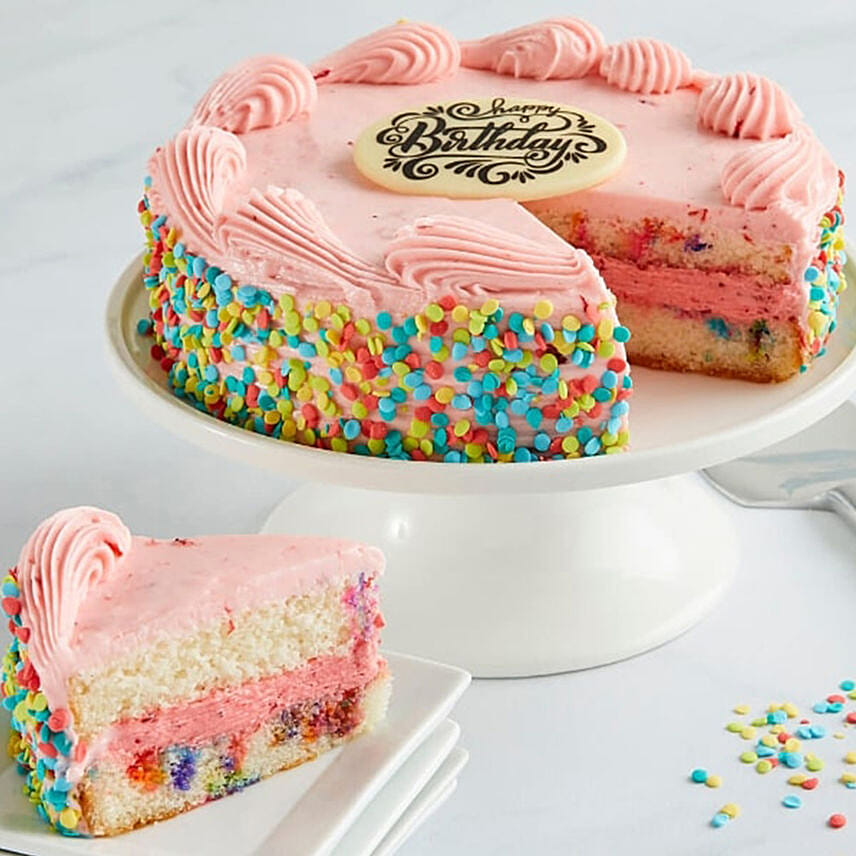 Two layers of yummy confetti cake and sandwich a scrumptious blend of strawberry filling and frosting; then we finish the cake with more strawberry frosting and confetti sprinkles on the side. A sure hit for fruit lovers all-over. Cake Size - 7"