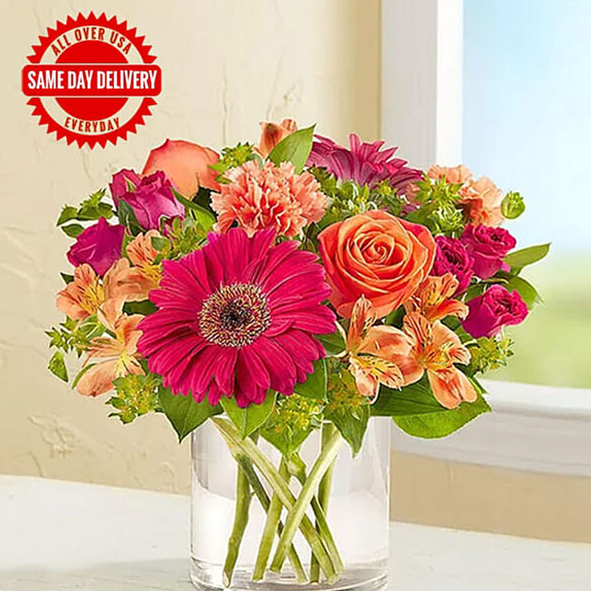 • All-around arrangement with orange roses, carnations and Peruvian lilies (alstroemeria); hot pink Gerbera daisies and spray roses; accented with assorted greenery, artistically designed in a clear glass cylinder vase.