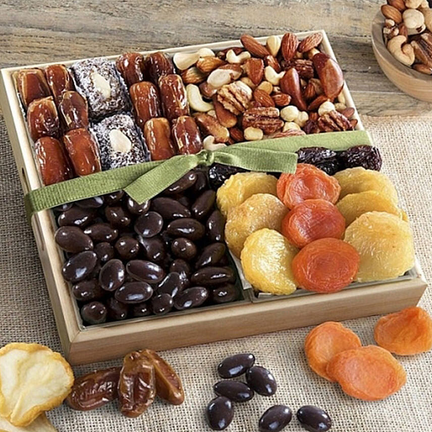 This impressive tray holds an enticing combination of sweets and savories. Healthful dried fruits like pears and apricots are paired with crunchy, roasted, salted mixed nuts and decadent dark chocolate covered almonds. It is a true, premium quality taste sensation.