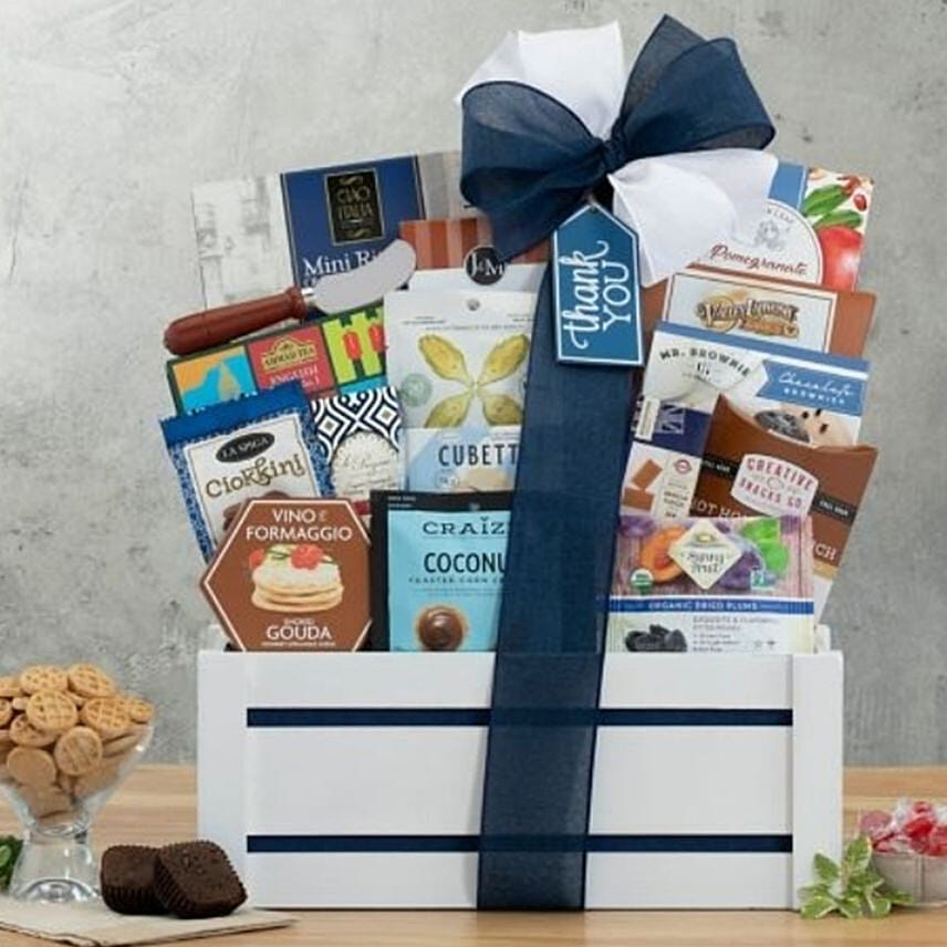 • Say thanks with this gourmet gift filled with sesame cranberry cookies, organic dried plums, Poshi basil and thyme atrtichoke snacks, Le Preziose fruit jelly candy, English tea, sesame crackers, smoked Gouda cheese spread, vanilla fudge and so much more; it's a great way to recognize those who have helped.