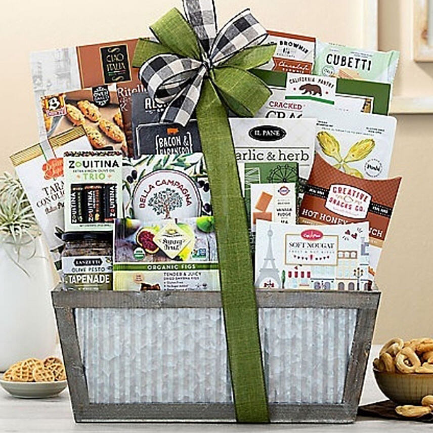 • Sundried tomato and cheese baguettes, cracked peppercorn crackers, garlic herb dip mix and a trio of olive oils, vanilla fudge with sea salt, bacon habanero snacks, olive pesto tapenade, organic dried figs, Italian sesame cranberry cookies and Taralli, basil and thyme artichoke snacks, hazelnut cookies, olives and much more make The Connoisseur our go-to gift for families, friends and clients.