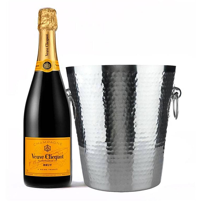 Veuve Clicquot's signature brut non-vintage is loved the world over for its crisp, full flavors, consistent quality and celebratory yellow label. The predominance of Pinot Noir provides the structure that is so typically Clicquot, while a touch of Pinot Meunier rounds out the blend. Chardonnay adds the elegance and finesse essential in a perfectly balanced wine. We've paired it with a hammered stainless-steel ice bucket in this beautiful gift.
