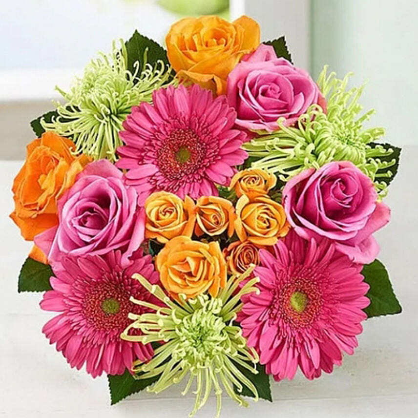 • Bouquet of of roses, spray roses, Gerbera daisies, and Fuji mum.